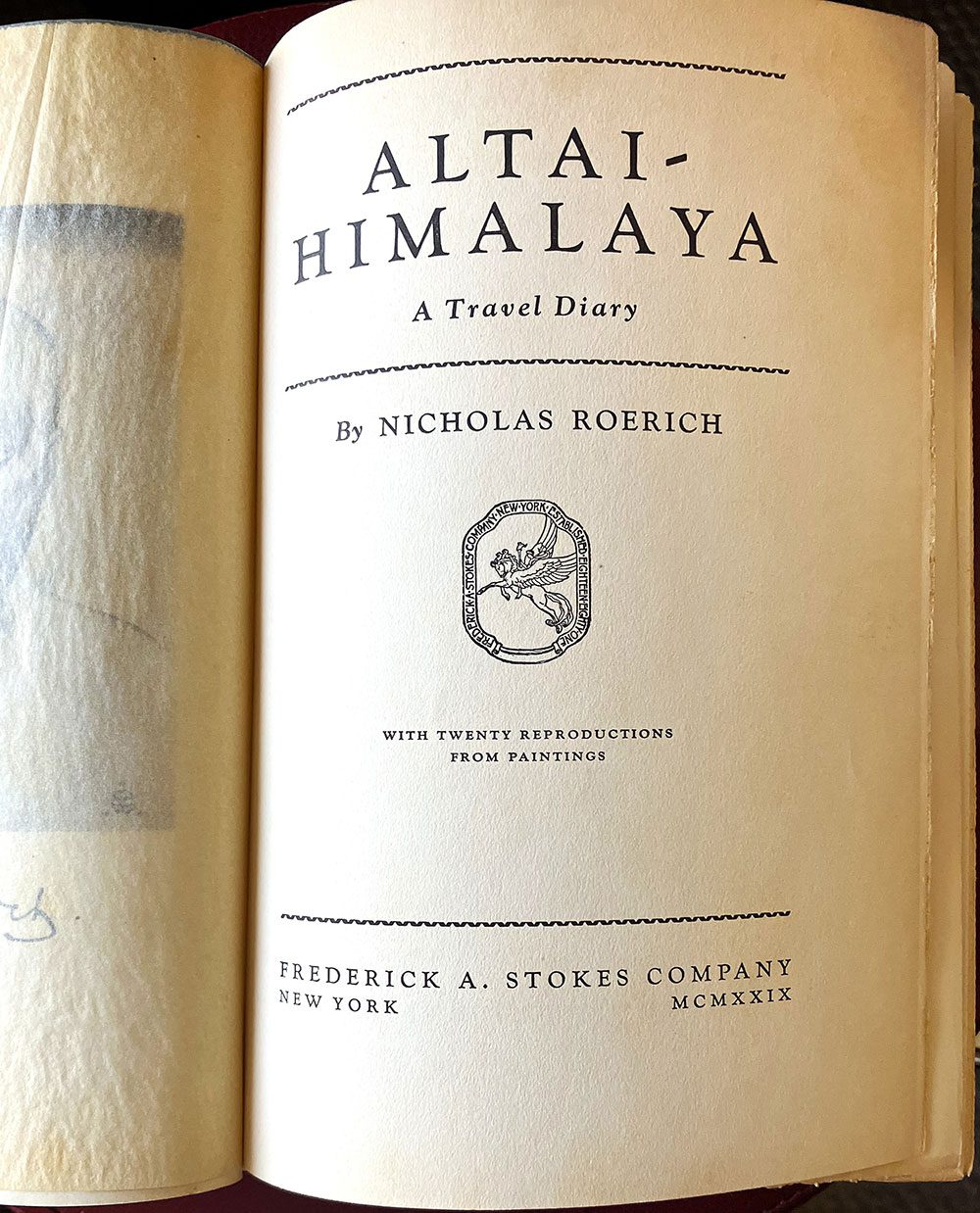 Altai-Himalaya: A Travel Diary; Nicholas Roerich; Frederick A. Stokes Co., New York; 1929; First Edition; 9.5 × 6.5 × 2 inches; 407 pp. Map printed on front free endpaper; frontispiece portrait of Nicholas Roerich; 20 plates after Roerich’s paintings. Hardcover. Bookseller since 1968. 10% off first order.